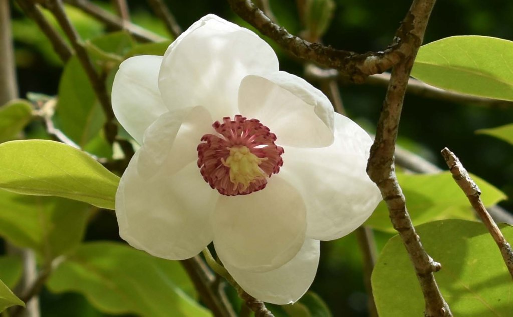 Magnolia sieboldii, a primitive angiosperm, in the Fountain Garden. The magnolias evolved before bees and are effectively pollinated by beetles, 29 June 2021.