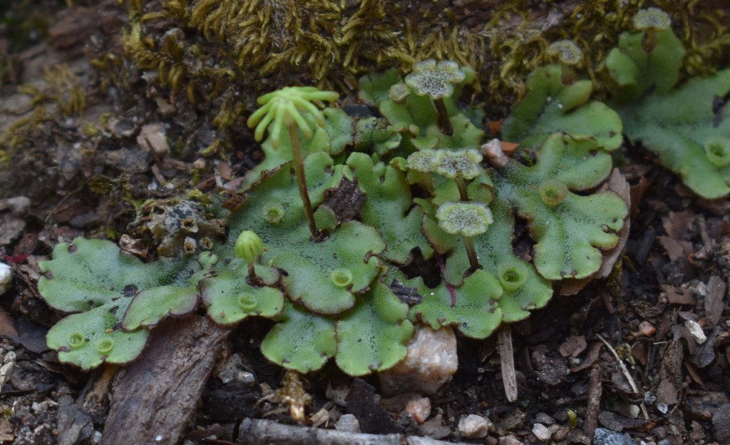 The liverwort, Marchantia polymorpha,. The gemma cups, on the thallus are for vegetative reproduction; the umbrella-like structure (left) is the female receptacle and the male receptacle is to the right. 30 June 2021.
