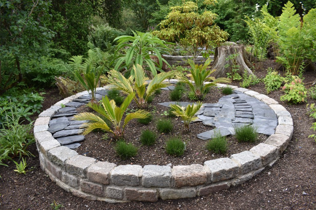 The first raised circular bed represents the earth at a time when the continents made up one land mass – Pangaea – surrounded by the oceans (the slates) from about 350 million years ago (mya) to 200mya when it began to break up – a process that continued through Triassic and Jurassic periods. James has chosen equisetums and cycads and for this bed. Cycads, said to be the favourite food of dinosaurs, may look like palms, but they are more closely related to ginkgo trees and conifers like our native Scots pine. Cycads are not completely hardy and James will be taking a gamble when he leaves them out over the winter. On the other hand moving them in and out each year sets them back – they are slow growers anyway.