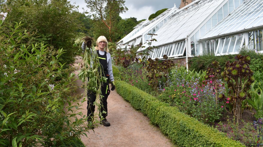 Cecilia hold up a monster buttercup she has just removed from the Trough Garden, 12 July 2021.