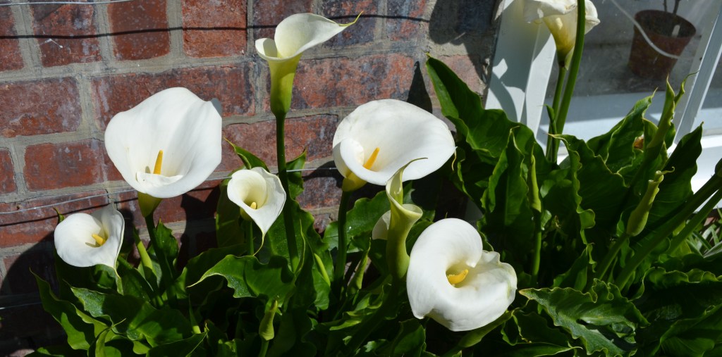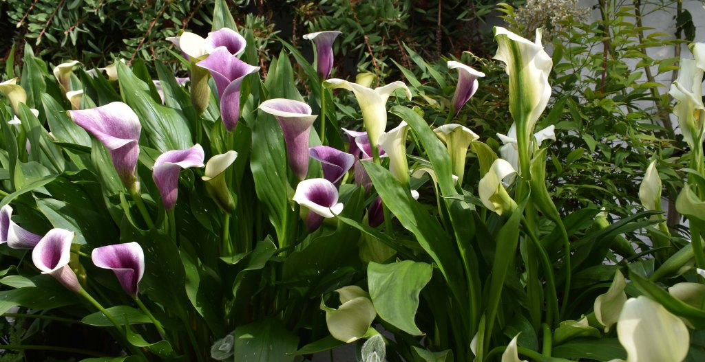 The calla lilies, Zantedeschia sp, now on show in the glasshouse, belong to the Araceae (Lords and Ladies) family and are related to our native arum lilies. One of the species, Zantedeschia aethiopica, is hardy and grows outside. It has occasionally naturalised in the south of Britain. The flowers are held on a rod-like spadix and surrounded by the petal-like spathe. Since they come from South Africa most calla lilies are tender.