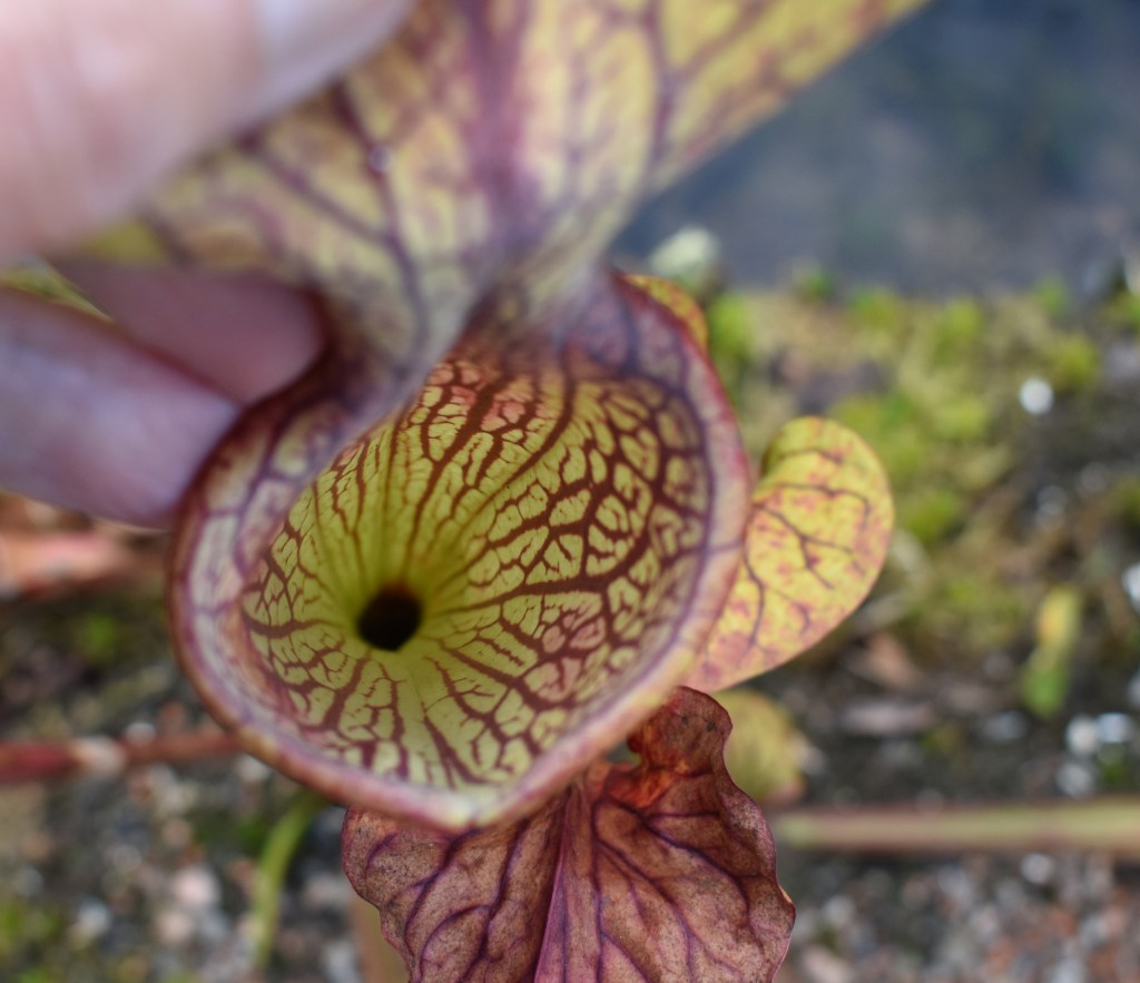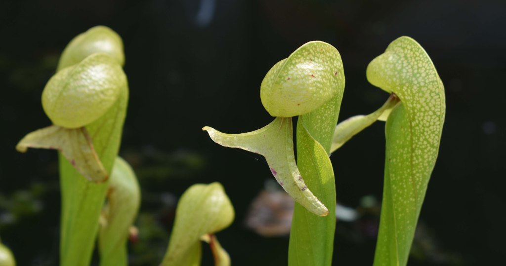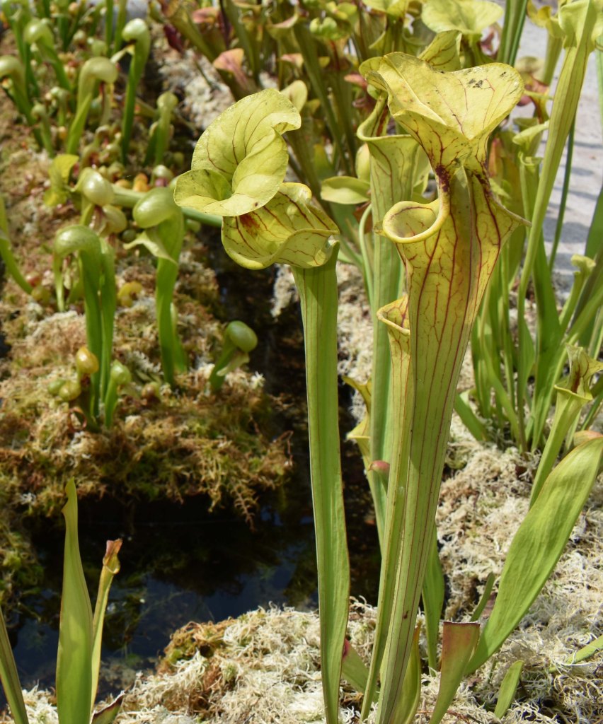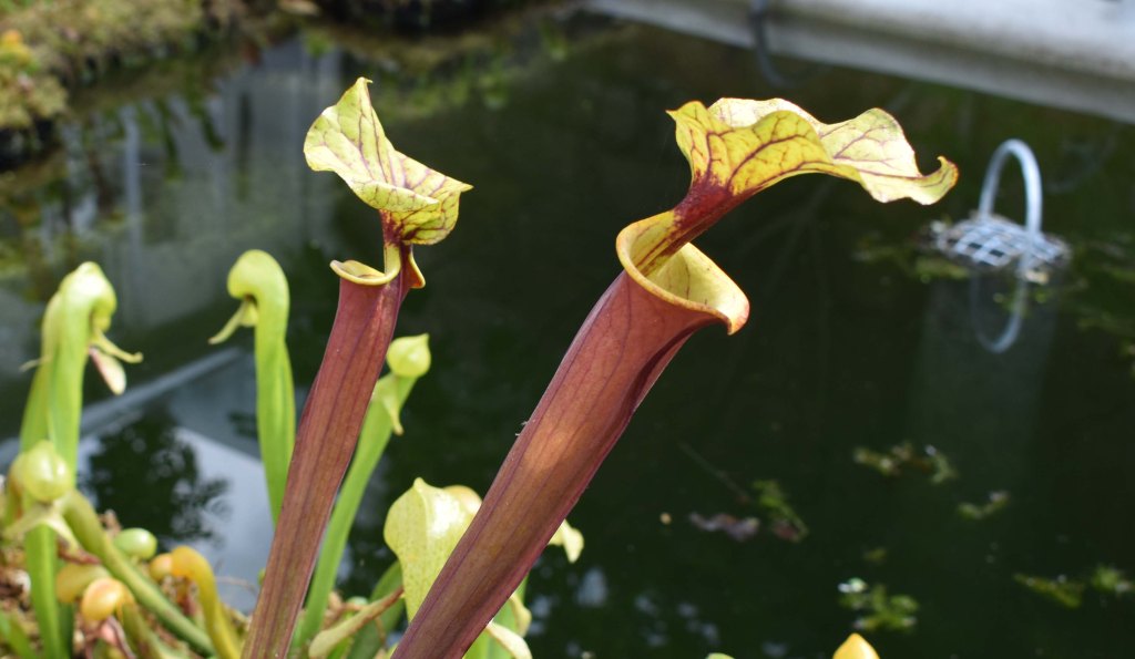 Because their habitats are threatened by modern agriculture and development, and people like to dig them up, they are not so common as once and one species, Sarracenia oreophila, is listed on the International Union for Conservation of Nature (IUCN) as ‘Critically Endangered’. The Crathes specimens were, of course, raised in a reputable nursery.