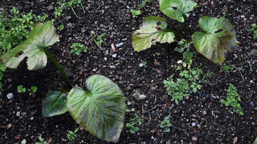 The Arisaema sp growing in the South Border, now covered in red berries, is of the same arum family. The skunk cabbage is another arum, as is the Amorphophallus genus – we have the devil’s tongue, Amorphohallus rivieri, (from western Yunnan) growing in the glasshouse.
