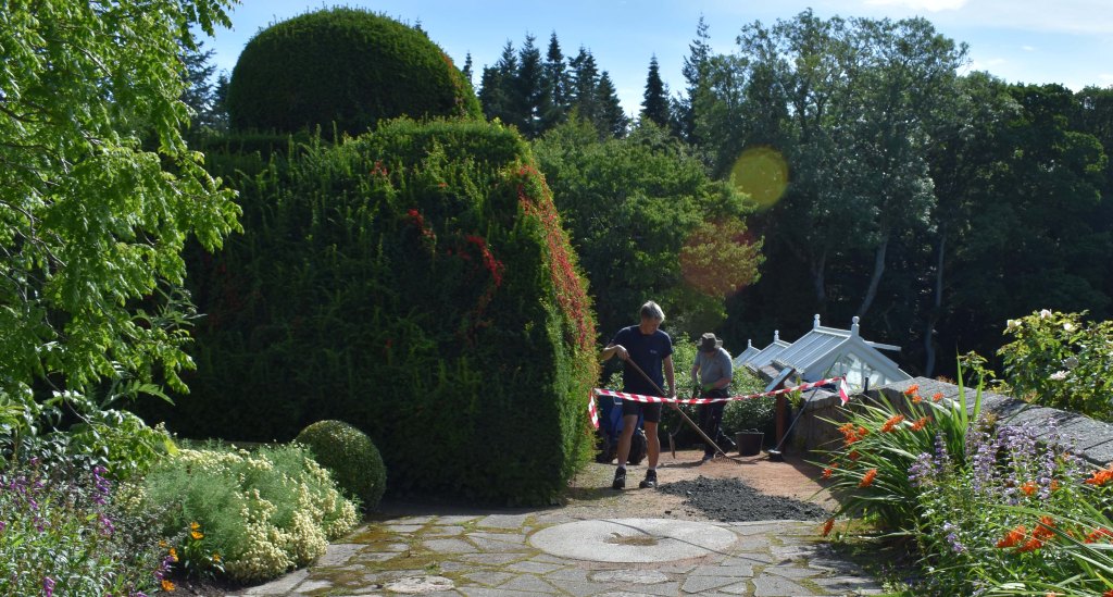 The much needed rain came in torrents and created drainage problems both outside and inside the walled garden. Davy has been busy with various diggers and tractors trying to sort the blockage by the garden gate. Inside the gardeners have been repairing the washed-away paths; a regular occupation. Gravel has washed into the dipping pool, signalling a need for a small barrier to divert the flow away from the pool.