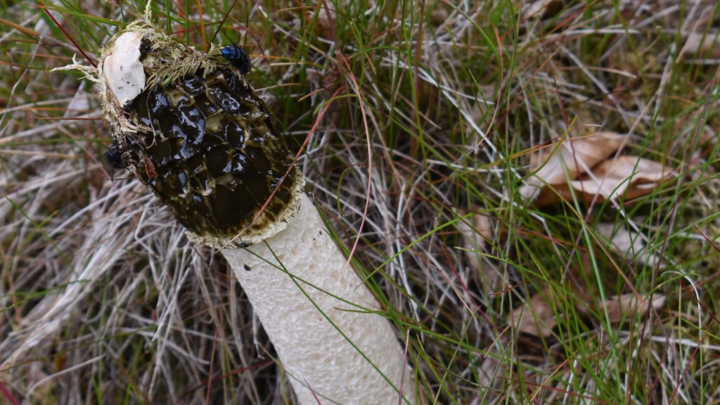 I came across a patch of beech fern, Phegopteris connectilis, which I have not previously noticed at Crathes. This fern remains small and is easy to identify because the two bottom pinnae point away from the apex of the frond. It grows in woodlands, but is not particularly associated with beech trees. It has been too dry for many fungi to be evident although I expect the recent downpour will change that. I did see what I think is the deadly poisonous panther cap, Amanita pantherina, and the stinkhorn, Phallus impudicus, still covered in gloopy spores with a bluebottle acting as suitable spore dispersal agent.