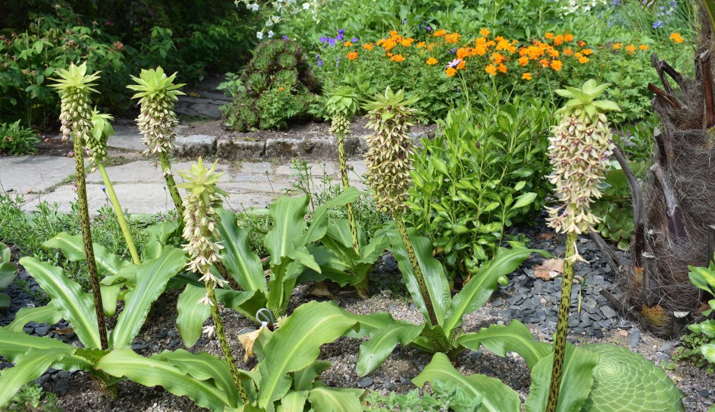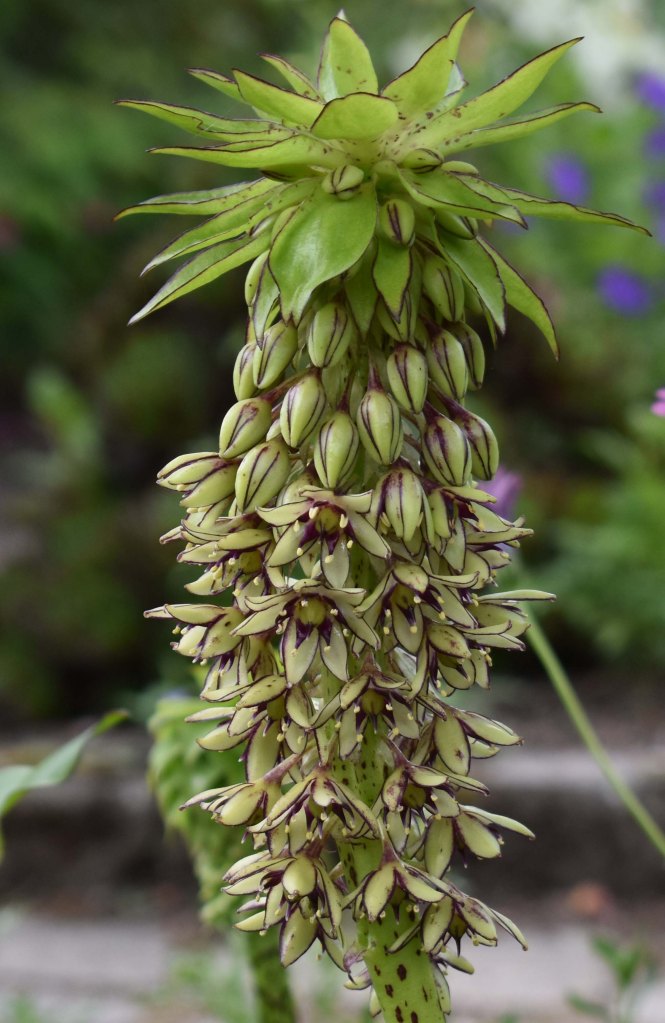 Also new to the garden and to me are the unusual pineapple lilies, Eucomis sp, that are in flower beside the glasshouses. I am much taken with these lilies which belong to the Asparagaceae family.