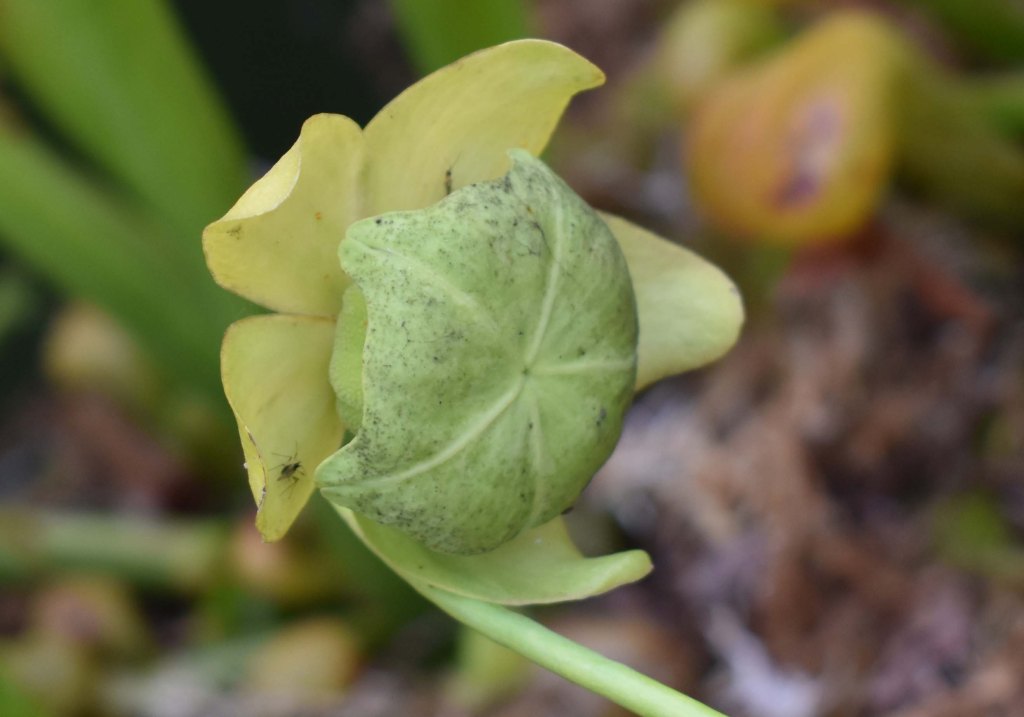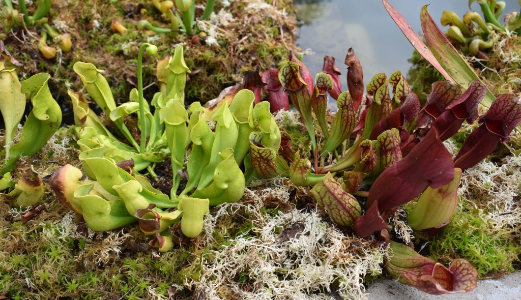 There’s a definite air of excitement as we view the dipping pool and its new carnivorous plants. In Scotland we have our native carnivorous plants – sundews, butterwort and bladderworts – but these North American plants are monsters in comparison. Some will grow to over a metre in suitable conditions. Both they and the Scottish plants seem to work on the same principle; or rather they have evolved to fill similar niches: boggy places with poor nutrients where they thrive because they supplement the nutrients by eating small animals – mainly insects. The butterwort and sundew leaves close up and trap small insects; the bladderworts are water plants that trap small crustaceans such as water fleas and aquatic insects like midge larvae. The larger America plants have developed pitchers into which insects, and the like, fall and are dissolved in a ‘soup’ of enzymes.