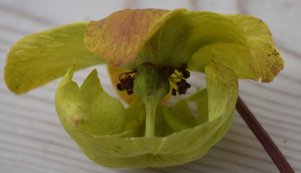 Their flowers are similar and unusual. The petals, which hang down, had already been shed when the plants arrived in the garden, although new buds are forming. What we see now are three bracts and five sepals above the stamens and ovary. The style is expanded into an umbrella-like shape with the receptive stigmas on the pointy bits of the umbrella. The flowers seem to be adapted for cross pollination, flies crawling into the umbrella shape and getting dusted with pollen. The flower is said to have a ‘cat-pee’ aroma.
