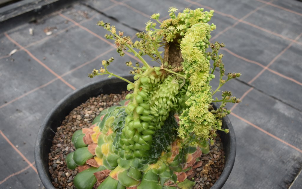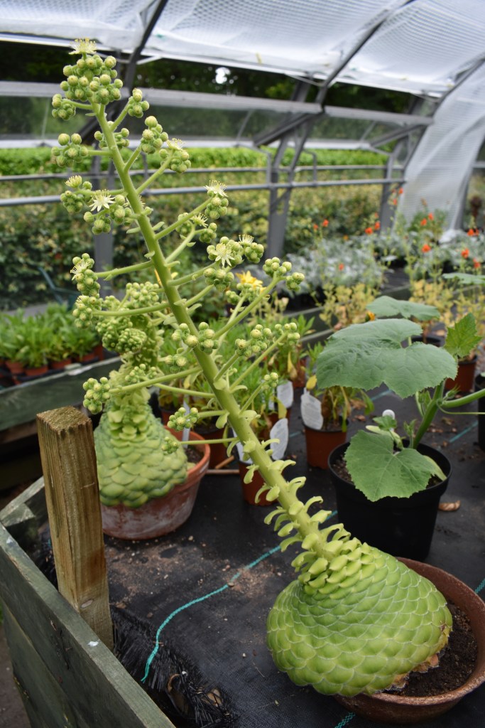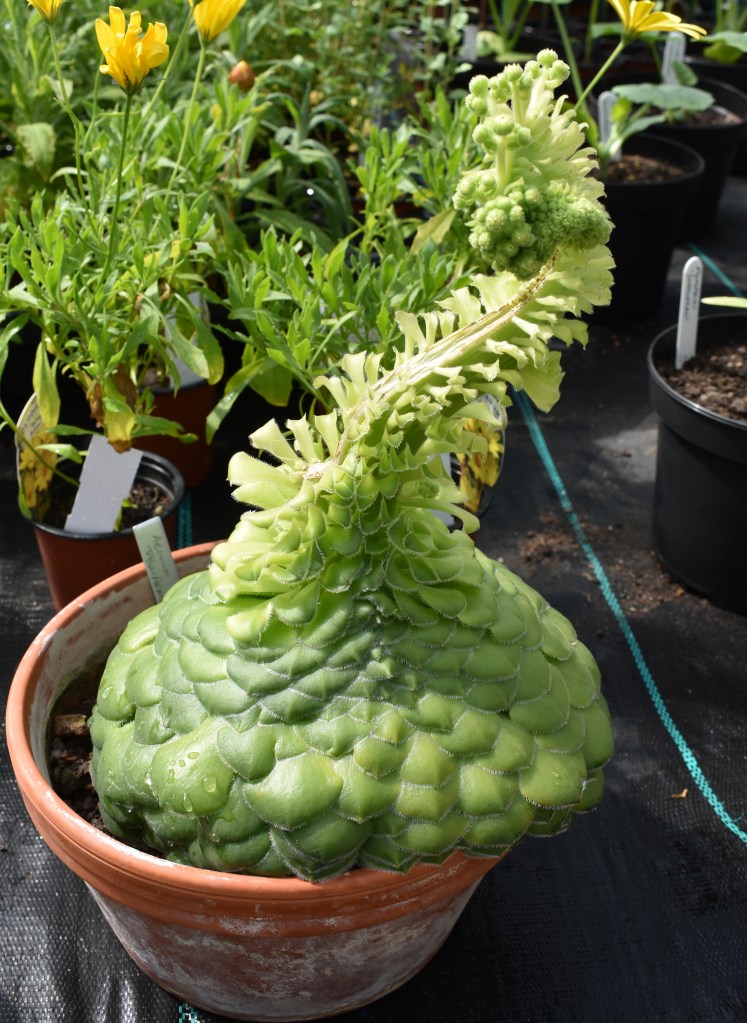 Genetics came up again when I was talking to Joanna about the Aeonium tabuliforme that is flowering in the broadspan. This plant is fasciated – ‘when several contiguous parts grow unnaturally together into one’ (Oxford English Dictionary).