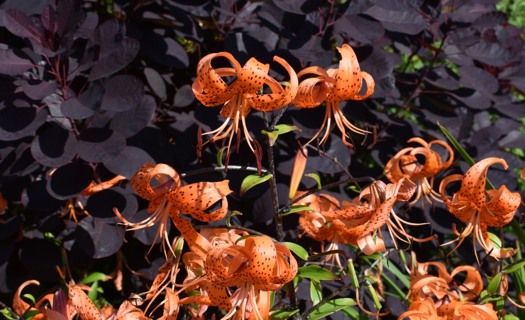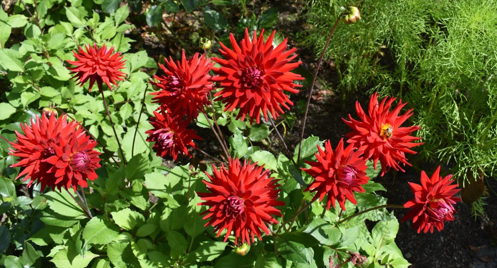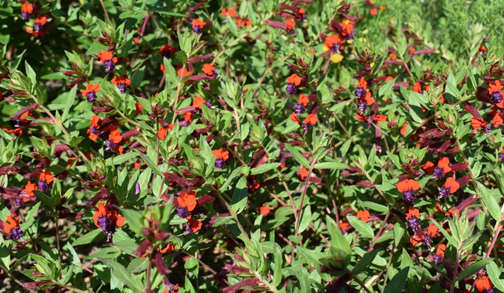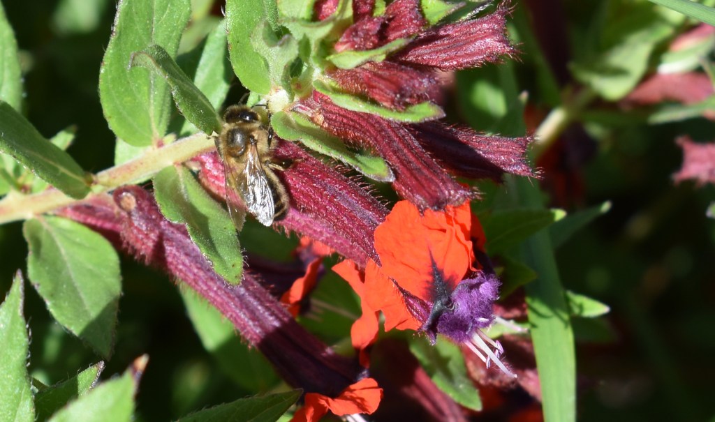 As August turns to September we enjoy the hot colours of summer: the tiger lilies; the red dahlias; the orange heleniums, the many salvias, and – new to the garden – the little bat-faced cuphea, Cuphea llavea ‘Torpedo’, which makes a low mound of bright red and purple flowers. The cuphea is a native of Mexico and its long, purple, hairy calyx and corolla tube gives a clue to its main pollinator – the humming bird. Whilst there are no pollinators with long enough tongues to do the job in Scotland, here the bees have bored holes in the bottom of the calyx and corolla tubes and stolen the nectar. The two red petals give the plant its comical name.