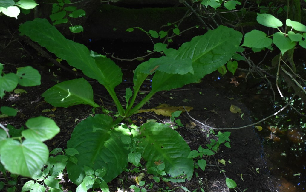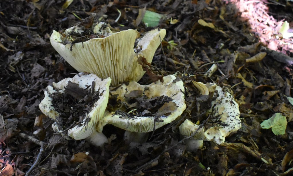 When I was nosing about around the yews at the millpond I saw some interesting fungi. The white fungi seemed to sprout where broadleaved tree trunks were lying rotting – often following the line of the trunk. Less welcome was the sight of the invasive skunk cabbage; there were more along the side of the Coy Burn.
