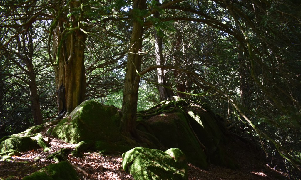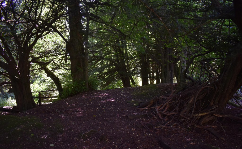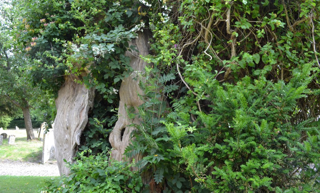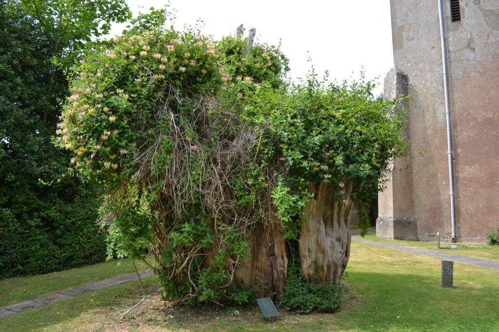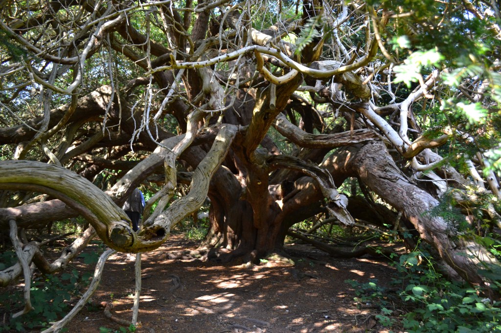 I was delighted to realise that I was familiar with some of the other yews that are represented in the hedge. The Fortingall yew, sometimes said to be 5,000 years old years old, is estimated by RBGE to be 1,500 to 3,000 years old and may be the oldest tree in Europe. It’s a long time since I was there – before the days of digital images. For centuries this yew has been a tourist attraction; the protecting wall surrounding it dates from the late eighteenth century. The Selborne yew and the Kingley Vale yew wood were seen when we spent a holiday in the South Downs in 2015. A highlight (there were many) of that holiday was a day spent visiting the gardens of Jane Austen and Gilbert White the famous naturalist (1720-1793). In the churchyard at Selborne I was fascinated by the enormous stump of the ancient yew which had blown down on 25 January 1990. The tree was torn up in the gale and it was decided to cut the crown back and replant the massive stump. Cuttings were taken at the time and one is now successfully growing in the churchyard, but the parent tree was later pronounced dead. It appeared to re-sprout in 2008, but it is thought that the sprouts are seedlings, not clones of the parent tree.