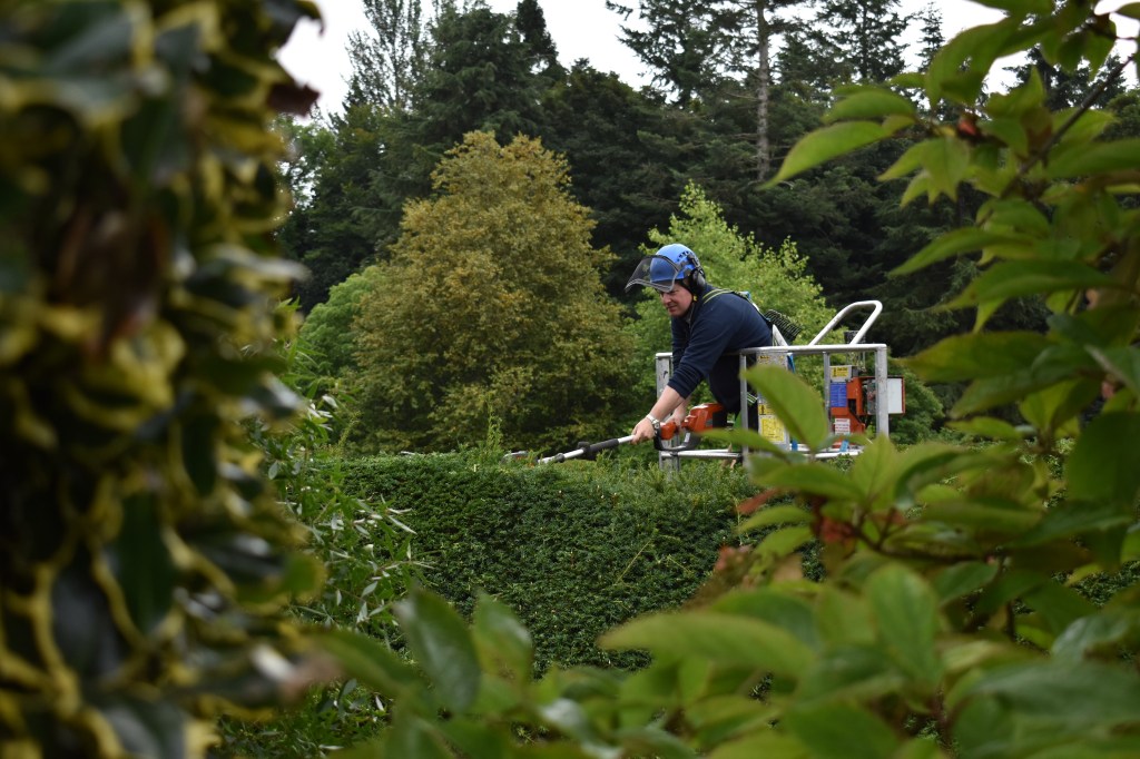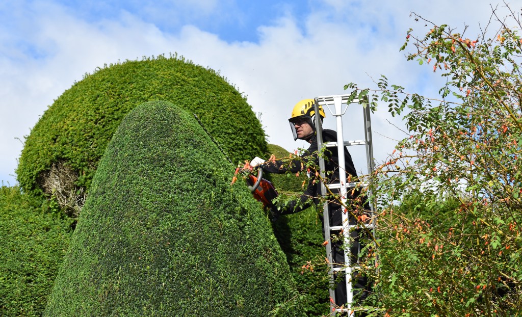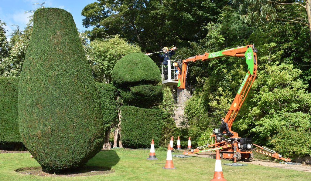 For the gardeners August is dominated by the cutting of the yew hedges. Nowadays it is facilitated by a Mobile Elevated Working Platform (MEWP). Mike and Steve are the main hedge cutters and they need to make good use of the MEWP because it is expensive to hire. However, this year it breaks down and for a while things are slowed up and ladders are used as they were in the past. But not shears! The cutters they use are electric which have the added advantages of being quieter than the previous cutters and being more planet friendly; the MEWP is noisy and still runs on diesel