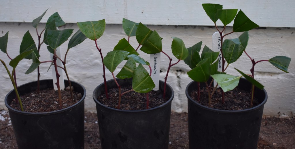 Many years ago a new plant was raised from cutting of this tree and planted in the gardener’s garden until such time as it was needed, but the years went by and the young tree is now too big to transplant. Another solution awaits in the yard because the cuttings that Joanna took in 2019 have grown amazingly. True, they could do with being a little bigger, but should there be an emergency the new cutting, which will have the same genetics as the old tree, could easily take its place.
