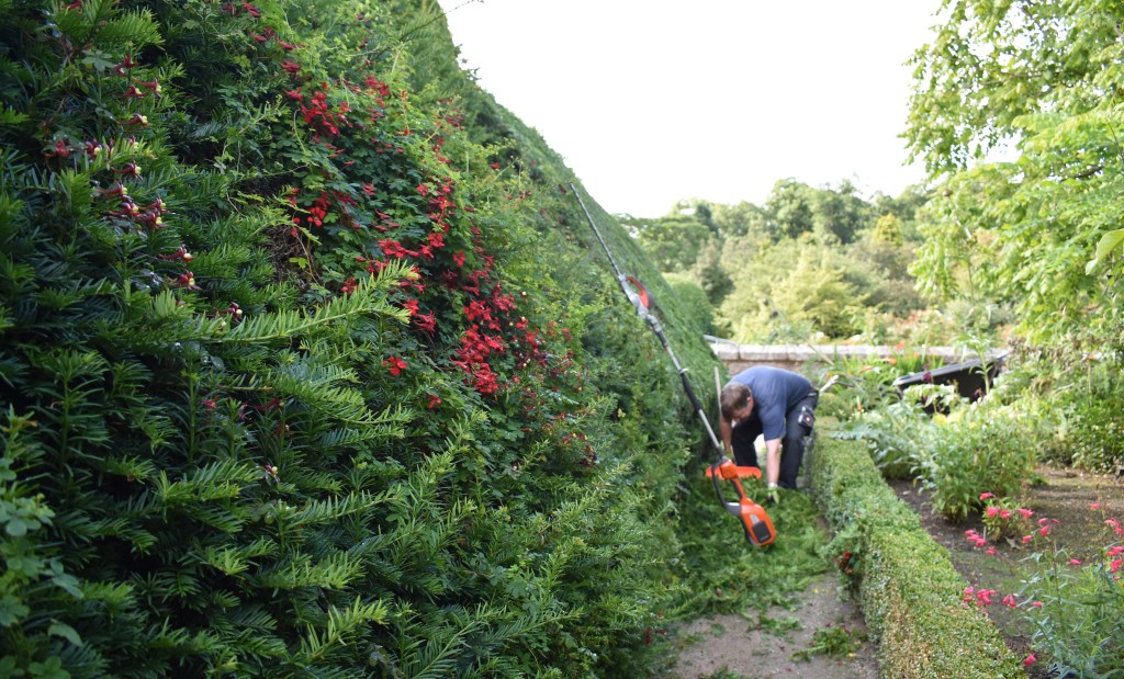 Some of the hedges were not cut last year and the Scottish flame flower, Tropaeolum speciosum, became even more of a nuisance than usual. There is a love/hate relationship with this Chilean nasturtium – definitely part of the Crathes summer scene, but rather a trial when it has to be removed before cutting the hedges. By the beginning of September the walled garden yews are just about finished, but there are still hedges and bushes to cut elsewhere – some around the nursery area and some at the West Lodge.