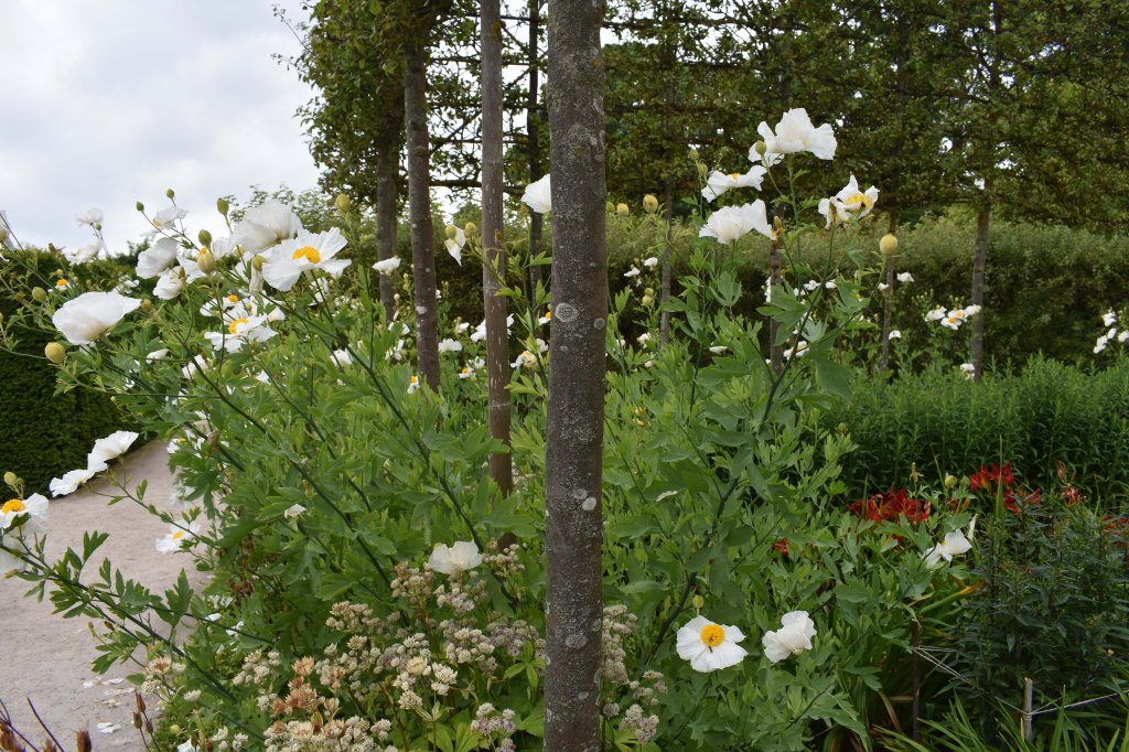 To reach it we walked up through the shady hornbeam arbour to find the mix of formal pleached malus, low lonicera hedges, medium height hedges of Cornus mas, and water rills. It was planted with hydrangeas, eryngiums, alliums amongst other flowers. With the roses mostly over and the many hedges there was not the exuberance of flowers that we have at Crathes but then there were berries – black and red currants, and raspberries – a visitor was helping herself. I was particularly taken with the profusion of Californian tree poppies, Romneya coulteri, which was a favourite of Lady Burnett and still grows at Crathes.