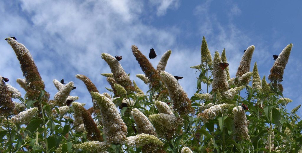 All through June and July I had been expecting the butterflies, only to be disappointed. I looked in vain at the buddleias both here and in Northumbria. Finally in mid-August there was a flutter of them on the white buddleia. I always think that the white buddleia looks rather scruffy when it begins to turn brown, but I take back my criticism when I see the profusion of peacocks and red admirals that gather on the White Border.