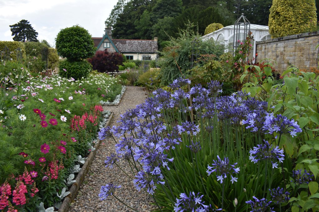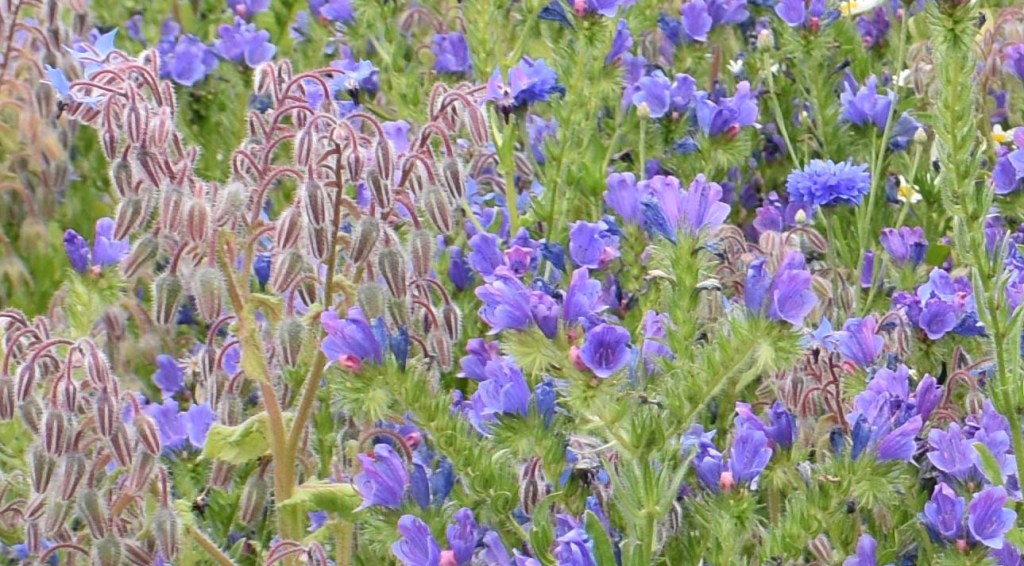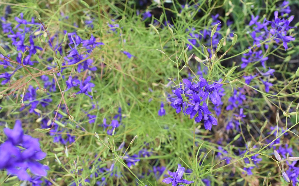 The weather was mixed on 25 July, mostly wet and blustery with occasional interludes of sunshine. The garden design was just of simple roughly paved paths with beds around a central square bed. There were fruit trees against the walls, heritage vegetables and herbs. The general effect, achieved with cottage garden annuals and perennials, was immediately enticing. As I sat on the bench amongst the flowers catching a drift of the scent of sweet peas, it was easy enough to imagine it as my garden. An unfamiliar plant that scattered its blue (sometimes white) delicate flowers around amidst the sweet peas, cornflowers, nigella and daisies was particularly attractive. Its long blue spur led me to find its name – Consolida regalis – an annual that I was pleased to find in my seed catalogue; this is definitely a plant for me in 2023.