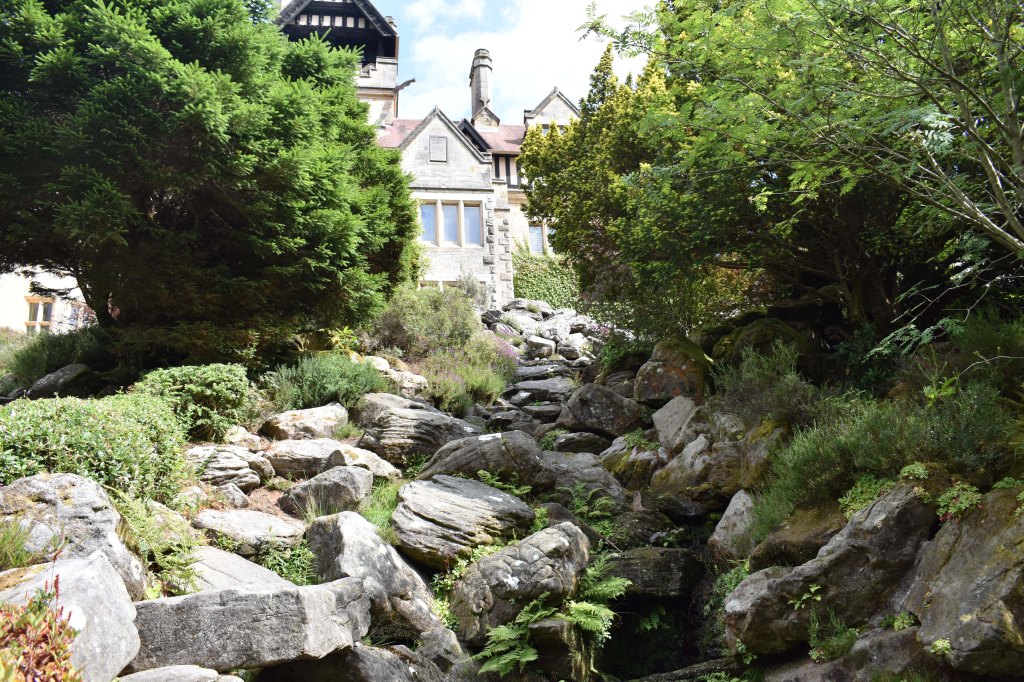Cragside, created out of the Northumbrian moor, is the very antithesis of the Lindisfarne garden. William Armstrong, a Victorian scientist who made a fortune working with hydraulics (London Tower Bridge for example) and manufacturing armaments, purchased a piece of wild rocky moorland near Rothbury in 1863 on which he built a hunting lodge. By 1869 he had decided to build a house that would be his and his wife’s permanent home. Margaret Ramshaw, his wife, was interested in horticulture and between them they created an amazing house and landscape. Of course the hard work was carried out by over 300 estate workers – gardeners, stone-masons and labourers. The house was lit by hydro-electric power with a six mile carriage drive and a whole terrace of heated glasshouses in the formal gardens. In July 2022 we could drive around the carriage way by car and although much was obscured by the reputedly seven million trees planted in the estate there were stopping off places to view various artificial lakes that were essential to the hydraulic functioning of the estate.