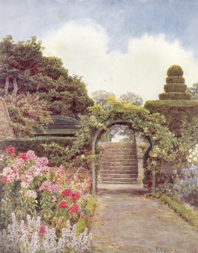 Stachys byzantina, previously S. lanata, known as lambs’ lugs in Scotland, was also much in evidence – another plant I need to have. We know it has long been grown at Crathes because George Elgood painted it growing in the Blue and Pink Border in 1899. Today it grows in a corner of the Trough Garden. Elgood’s painting was published in the book Some English Gardens (1904) with the accompanying text written by Jekyll. However, some of the text is inaccurate, reflecting Jekyll’s reliance on other people for information when she did not visit the place she was writing about.*