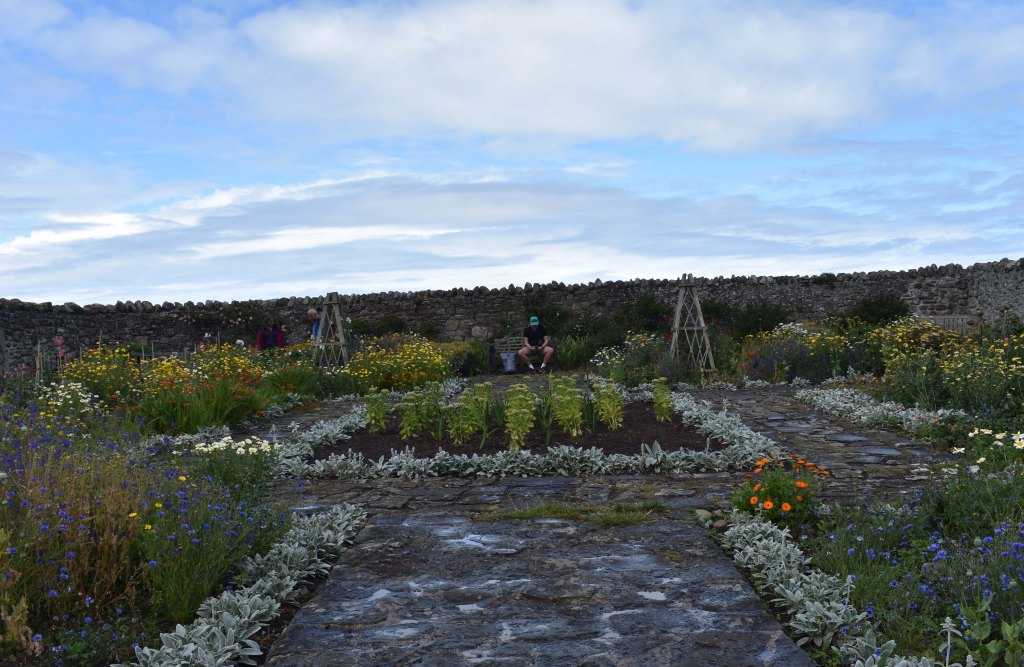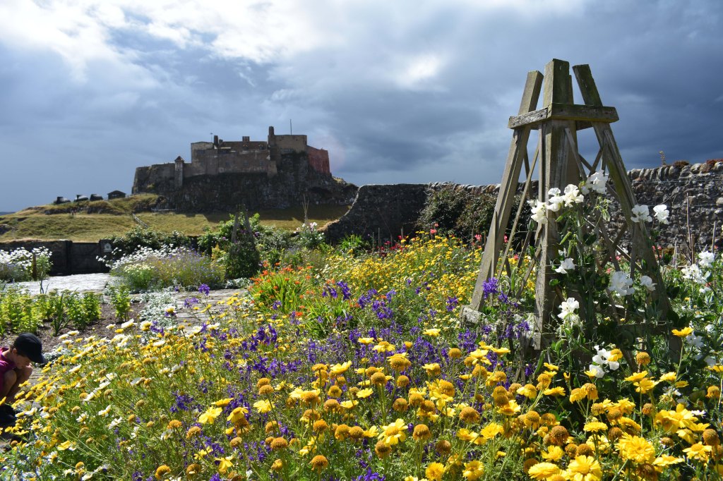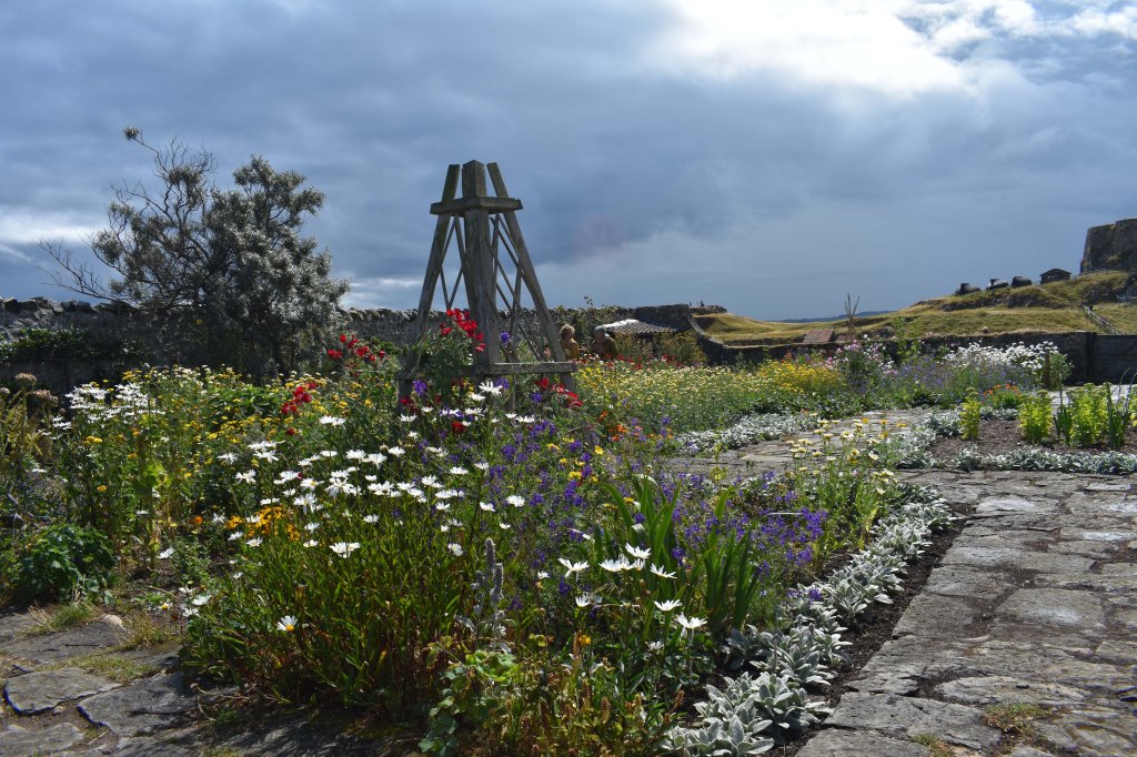 Anticipating the excitement of exploring new landscapes is now tempered with the limitations of age; gardens offer alternative and accessible horizons. I was thus delighted to visit three very different gardens during our recent holiday on the Northumbrian coast. The Gertrude Jekyll garden on Lindisfarne is small, unpretentious, and utterly charming. The walled garden once provided vegetables for the soldiers stationed at Lindisfarne from about 1570 – an outpost of the important fort at Berwick on Tweed where the English defended the town against the Scots for hundreds of years. In 1901 Edward Hudson bought the fort and employed the Arts and Crafts architect, Edwin Lutyens, to convert it to a holiday home – a castle. Hudson was the editor of Country Life, a magazine to which Jekyll contributed. Jekyll was also a friend of Edwin Lutyens with whom she often collaborated when designing gardens. Although she did not usually visit the gardens that she designed in her later life, it is not too surprising that Jekyll and Lutyens travelled together and stayed at the Lindisfarne castle as guests of Hudson in 1906. The garden of Jekyll’s design was completed in 1911 with the help of Lutyens. Nearly a hundred years later, in 2003, the garden was replanted using Jekyll’s original planting scheme.
