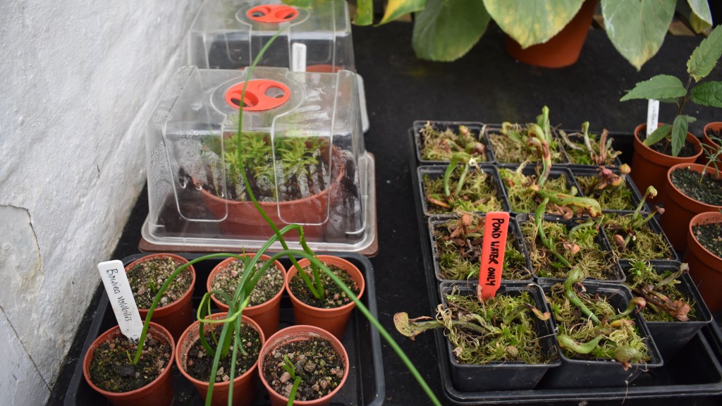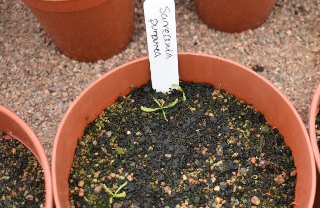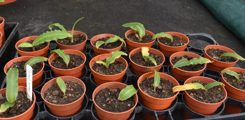 Seeds collected from the carnivorous Sarracenia purpurea which were growing by the dipping pool this summer have already been sown and are now germinating. Baby cobra lilies, Darlingtonia californica – the other American carnivorous plant – have been gathered from the adult plants and are now being grown on. Joanna also collected seed from Callistemon citrinus (bottle brush) and the little purple roscoea. The roscoea germinated only to be eaten by slugs and the bottle brush has not as yet germinated. Seeds bought last year that have germinated include a new, red, passion flower, Passiflora vitifolia, and the intriguing Bowiea volubilis – the climbing onion, from Africa, which I have had to look up online; I fancy growing one of these myself.