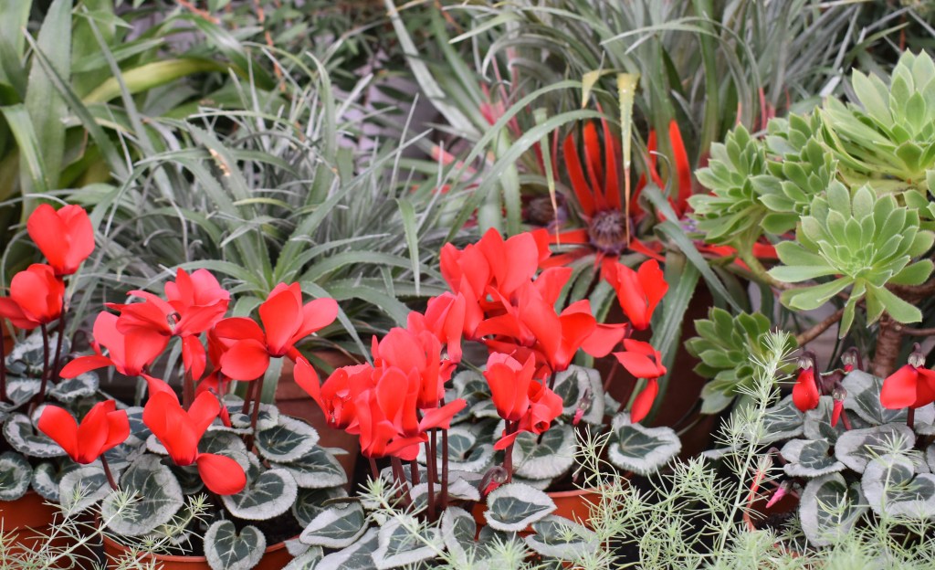 In the glasshouse the pelargoniums have been cut back for winter and and the Metalis range of miniature cyclamen has taken their place. This range comes with silvery leaves and in with varying colours of flowers. The flowering flat topped Aeonium tabuliforme and the pineapple lily, Eucomis bicolor, have been taken in so that the seeds can finish ripening and can be collected. Of the eucomis seeds collected in 2020 nearly all germinated and are now being potted on. How many years it will take to achieve a flowering bulb is all part of the experiment, but the original plants can be planted out again next year to make another show.