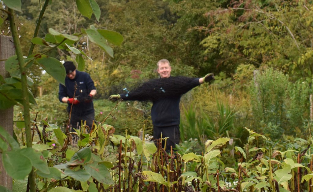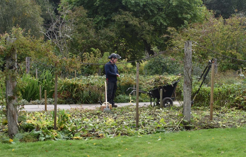 The main herbaceous borders (June, Double Herbaceous and Blue and Pink) all get the same treatment. The plants are cut back by hand to just above net height. The nets can then be removed and stored for next year. I am reminded of the hanks of wool we used to wind into balls as Mike twists the netting round Steve’s arms until he (Steve) looks rather like a scarecrow with immobile arms stuck out. With the netting out of the way the electric cutters can be used to clear what is left. Then the beds will have to be weeded, both before the winter and then again in spring. There’s no easy way to get that glorious summer show. Herbaceous borders are hard work.