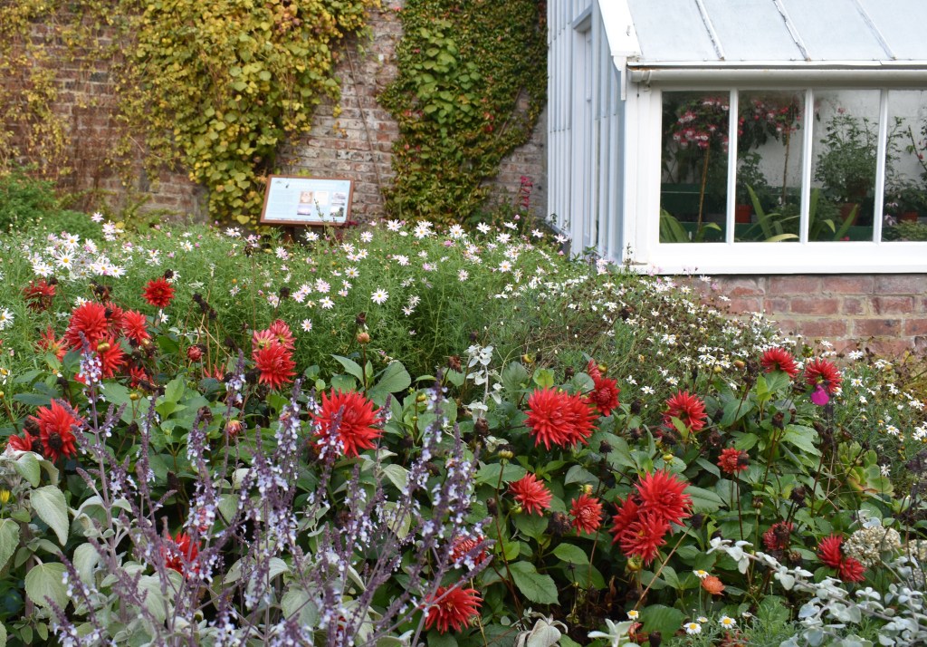 The white border is only netted in part and Kiran and Jenny (volunteers) have been cutting back and weeding. Kiran rebels at cutting down the acteas and one plant is left to appease. The hydrangeas are also left on this border for they are autumn specialities. In the Upper Pool Garden the north herbaceous bed gets cut back a little later and the central beds with the salvias and fuchsias will be left as long as possible. The beds beside the glasshouses are also full of salvias, and dahlias are still putting on a good show.