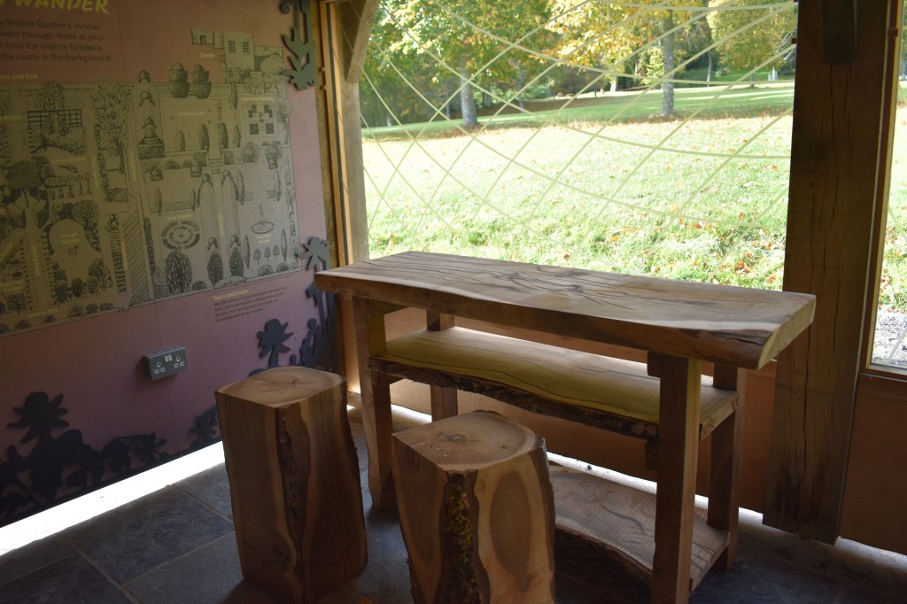 Progress is being made in the entrance building. A walnut bench with two stools has arrived, made from the old walnut that fell in storm Arwen. An attractive theatre of plants growing in the garden is maintained – mostly by Joanna.