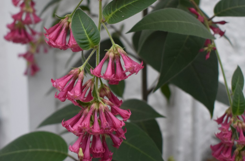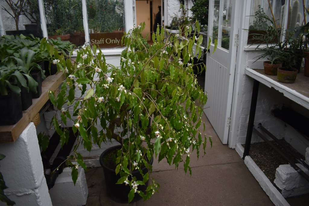 In the glasshouses the glorious scent of the Camellia tsaii caught my attention. This tender weeping camellia, from China, Burma and Indochina was first introduced by George Forrest in around 1917.  It is being moved about as Joanna cleans and paints. Nearby is the Cestrum elegans ‘Rubrum’, from Mexico, also in full flower.