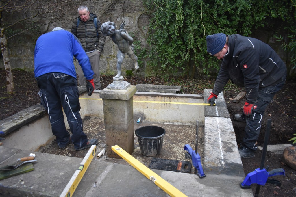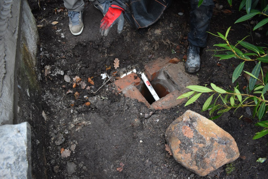 In the walled garden the frost was not so intense. The gardeners were busy on their various winter jobs. Steve was still working on the doocot pool drainage. There was much adjustment and rebuilding of the walls to make sure that there was no leakage. The blocked overflow was sorted and a new soakaway pit was built using an old chimney pot.