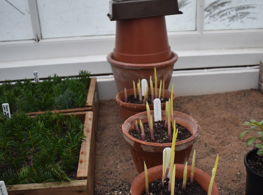 Joanna shows me the lily of the valley that she has been forcing for the show houses. This was a Victorian practice devised to have the flowers for Christmas. A few plants were dug up from the garden, in November I think, and planted in pots. They were then left out in a safe place to catch a cold spell of weather – not a given these days, but obligingly arriving in late December. The pots were taken in just before Christmas and given some bottom heat. They were kept in the dark for about three weeks. As the lids were lifted and the light let in we could see the emerging flower buds. Next week they will fill the show house with their delectable scent.
