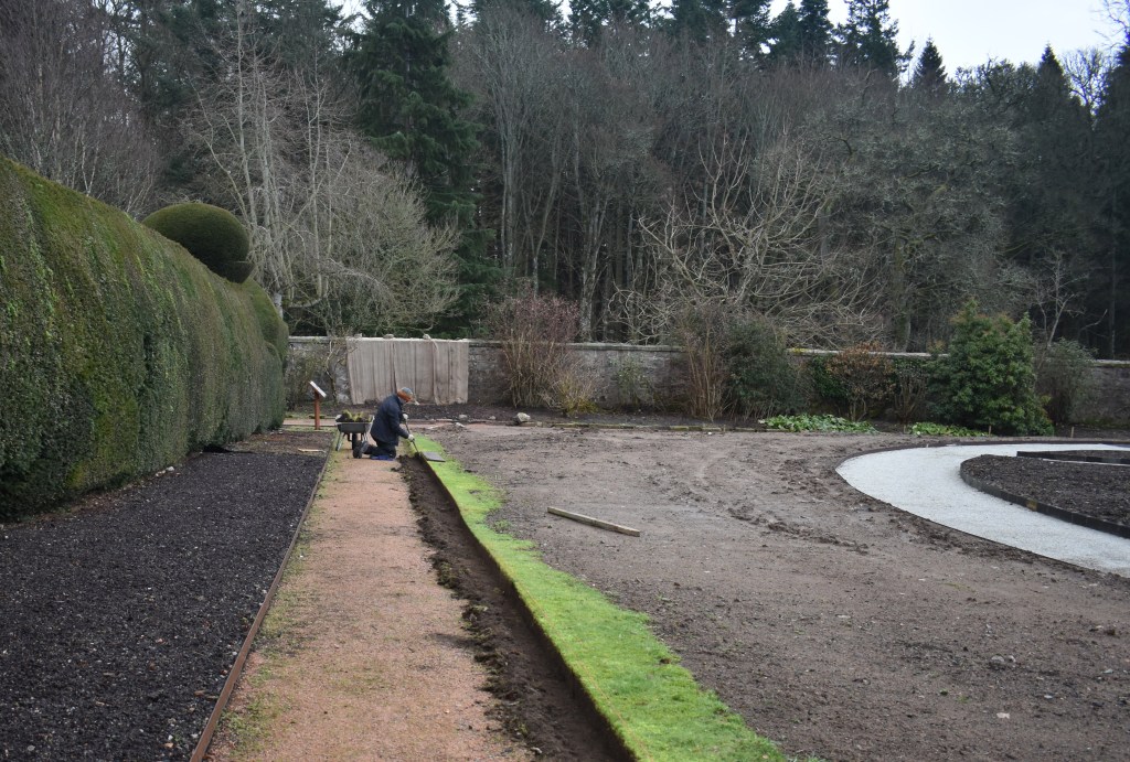 Mike and Emily were also dealing with drainage – in the Rose Garden. Here, the cobbles for channelling the water are doubling as a decorative feature along the top and side of the path down to the summerhouse where the water running through the sand that holds the cobbles in place can connect to a main drain that runs from the centre of the summerhouse. Andy is trimming the grass edges in preparation for the new metal trim. A stout yew root may be a problem. In the Upper Pool Garden Kiran (volunteer) has been tidying up the beds and pruning the rugosa rose ‘Blanc Double de Coubert’. The regular winter work of pruning, compost and leaf mould spreading has been delayed because of Rose Garden work – a priority just now. The compost and leaf mould will help to conserve water if a drought should be part of the 2023 weather patterns. 2022 was the hottest year on record across the UK and in Scotland. Early January 2023 has been fairly mild, which though appreciated for day to day work and has allowed the gardeners to forge ahead, is not so much appreciated in the long run.