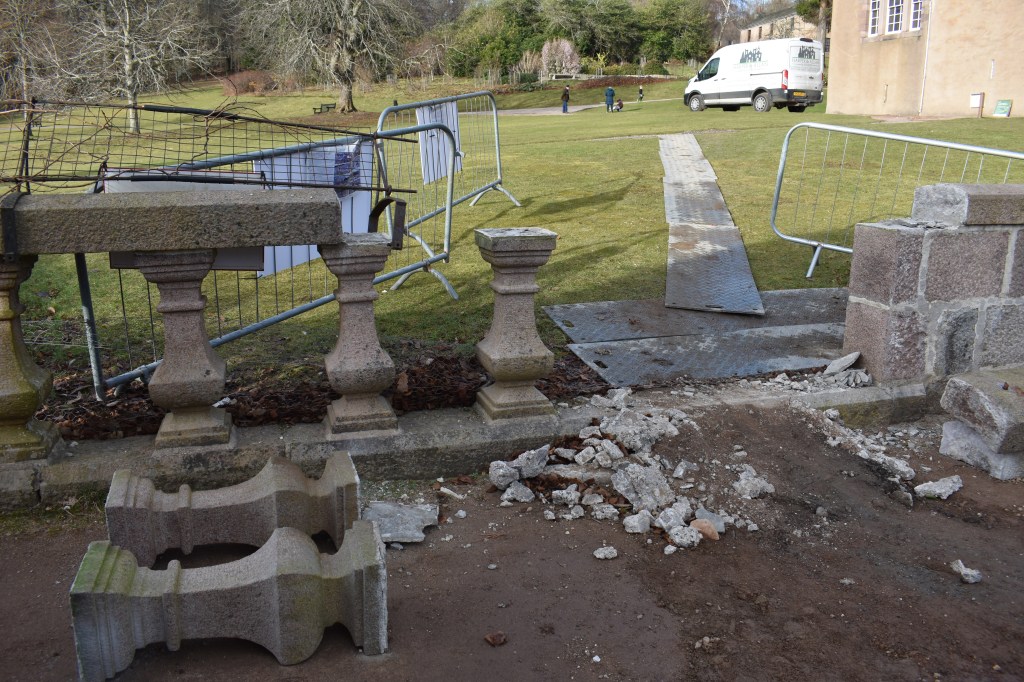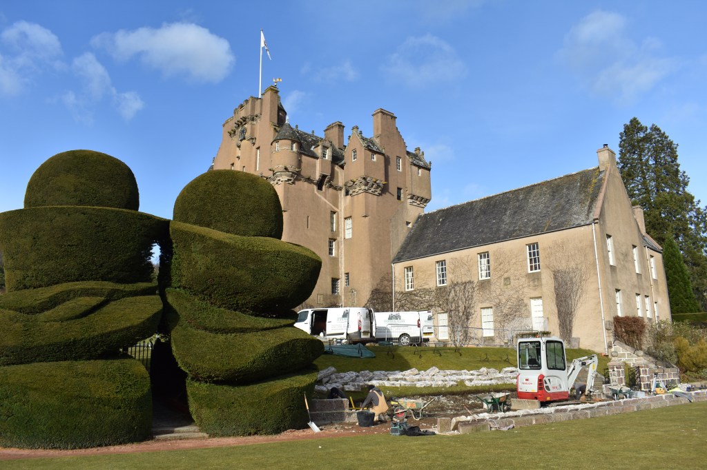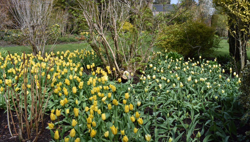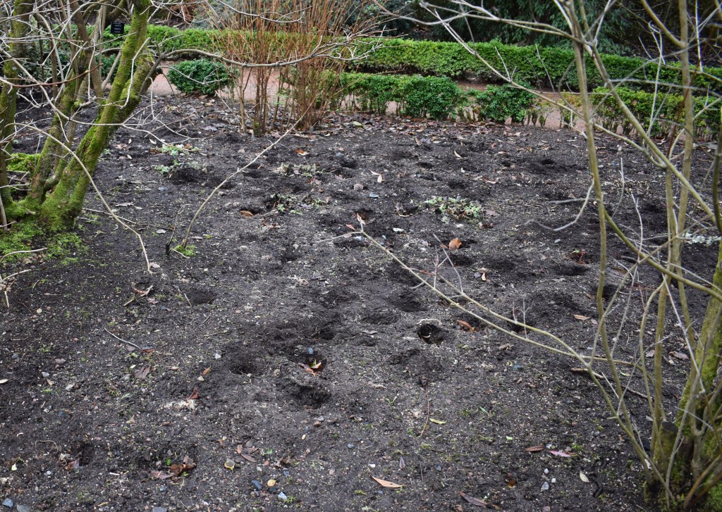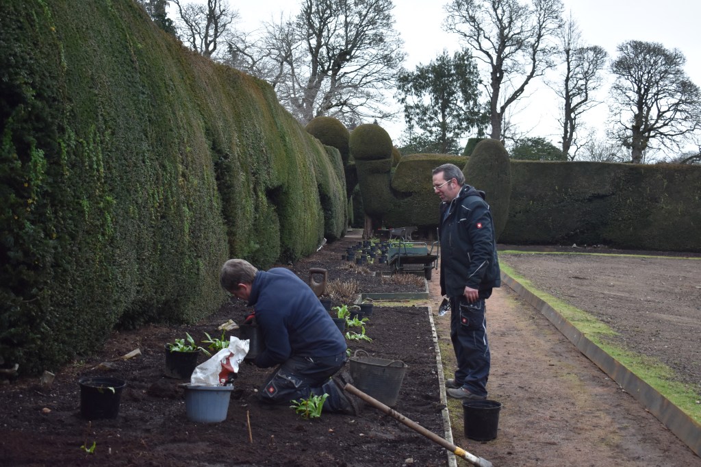Problems regarding invasive species is a recurring theme at Crathes and the recent works on the entrance building (with its alternative access), the rose garden (with a temporary hole in the wall), and the current replacement of the Croquet Lawn wall have created openings for one of the most opportunistic of mammals. The yew hedges provide ideal hiding places and when night falls the growing population can emerge to feast on a buffet of impressive proportions. Last year much of the annual bedding suffered and just now there is a banquet of tulips; almost all of the hundreds of bulbs, carefully planted by Steve in autumn 2020, have been dug up and eaten.