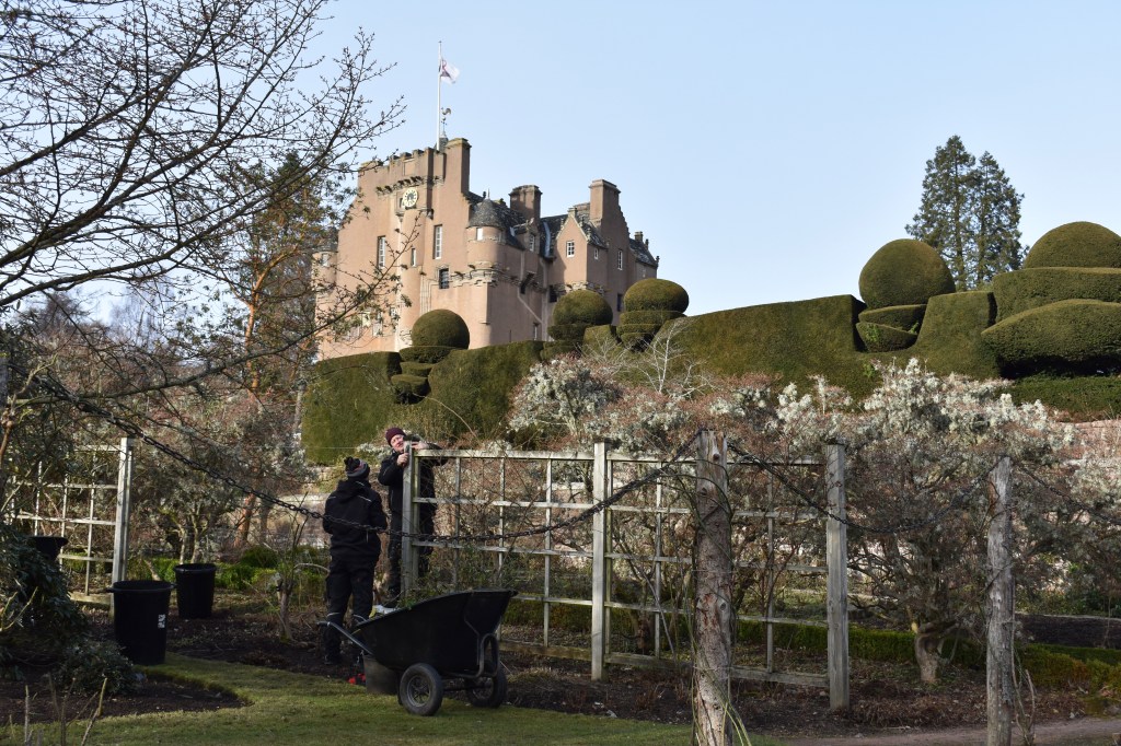 Back in the garden Andy is pleased to be able to get on with pruning. Mike and Steve have been tackling the roses. Where the arbutus fell in Storm Arwen the trellis was broken and so they use wires to support the Madame Alfred de Carrière – a vigorous white/pale pink rose.