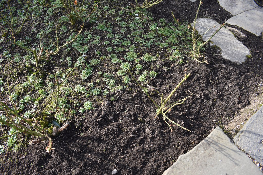 James and Steve have been planting Madonna lilies on the west border of the rose garden. This border, once hidden under the hedge but exposed since the cutback of yew about 23 years ago, has been a problem area for some time. Now the plastic weed barrier has been removed and the lilies have been planted along with camassias. Both are toxic and should be rabbit proof. James is hoping that the bulbs might naturalise. They have been given a good start with a handful of bonemeal to each planting hole.