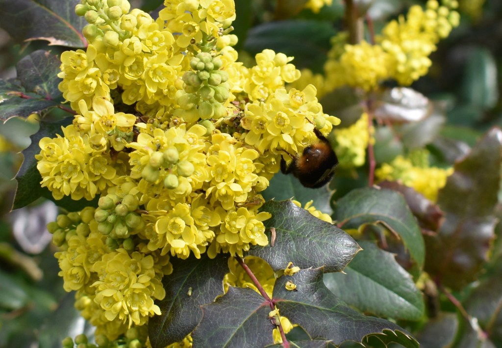 Out in the Fountain Garden I am encouraged by the Skimmia ‘Kew Green’. It is buzzing with bees, mostly honeybees, but also solitary bees.  There are ladybirds too, and shiny green bottle flies. Skimmias are dioecious, almost all cultivars being male or female; another way of ensuring cross pollination. ‘Kew Green’ is always male and will not produce the red female berries. It does have a lovely scent and it can pollinate other female skimmias so the bees give something back in return for nectar and pollen. The bumble bees are not evident on the skimmias; they prefer the Mahonia repens. In the paths I see one or two holes of the solitary mining bees. They have not been doing well the last two years may be because of the prolonged periods of hard frosts. At least some are there to carry on. The magnolias – which are blooming now – evolved before the bees and are pollinated by beetles.