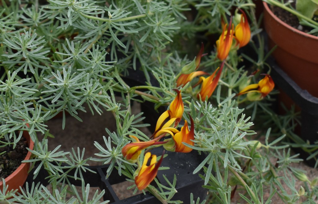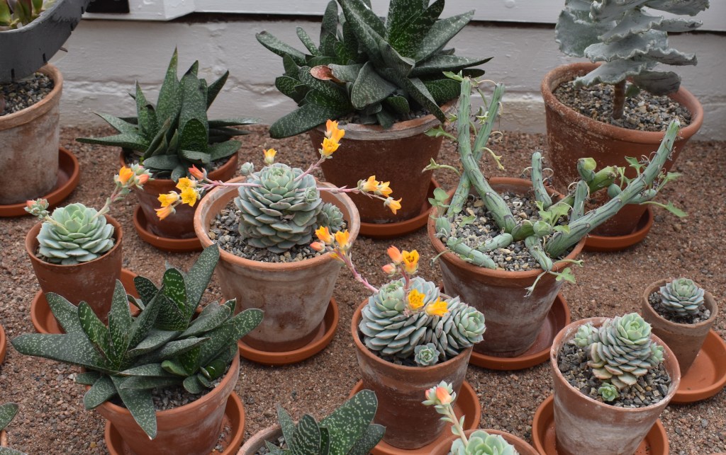 The succulents that were infected with root mealy bug have responded to changed management and are doing well. The succulent with the orange flower is Echeveria derenbergii.