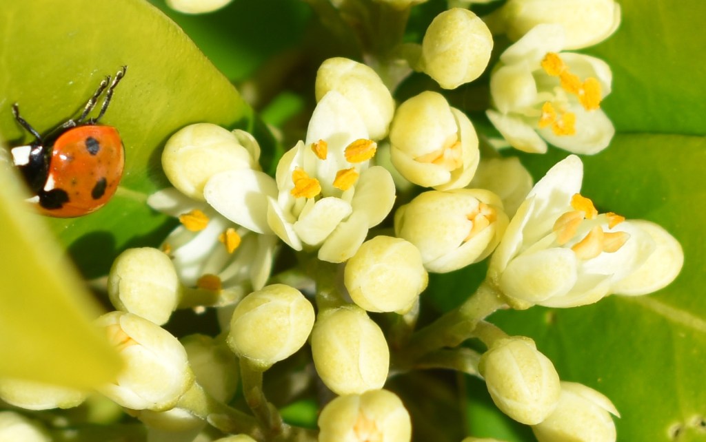 The flowers have no stigmas on this dioecious skimmia; on the left the gardeners’ friend, the seven spot ladybird, 7 April 2023.