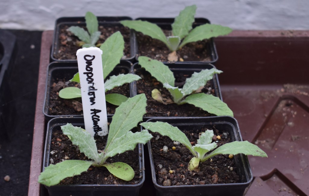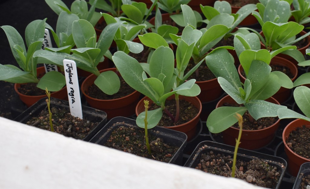 Walnut seedlings in front of Cerinthe plants, also grown from seed, 17 April 2023.