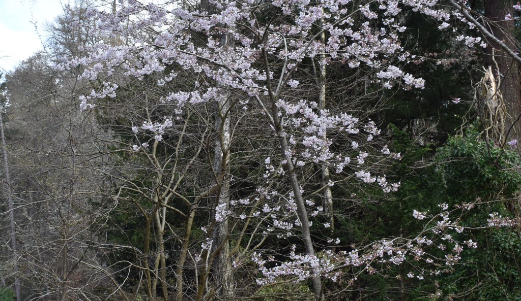 The prunus hedge that defines the White Border is flowering well, 17 April 2023.