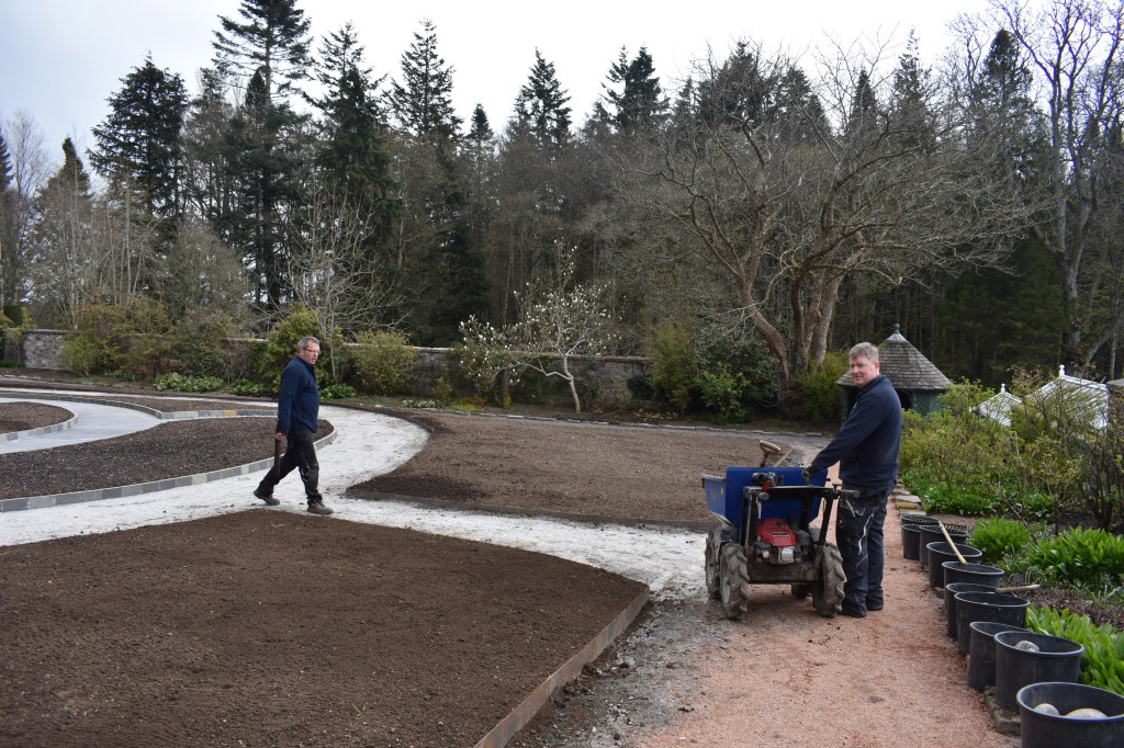 The outer beds have just been covered with grass seed; some gentle rain would be welcome, 17 April 2023.