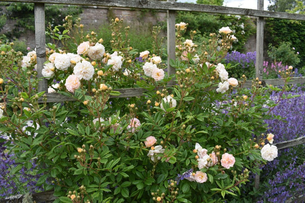 One of the earliest to flower at Crathes is ‘Glory of Edzell’. It blooms near the summerhouse in the Rose Garden and in the Trough Garden. The Trough Garden rose makes me smile because some years ago the gardeners tried to eradicate it from this part of the garden – it is a bit of a thug, putting up suckers all around.