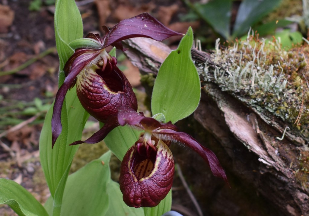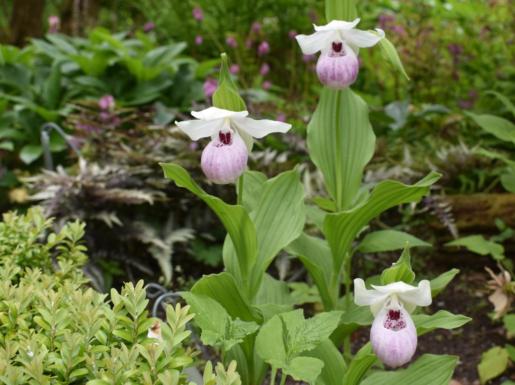 The roses have lots of competition; there are the old favourites like the catmints (every garden should have a catmint) and lupins, but also more unusual plants like the spectacular lady’s slipper orchids beside the doocot path. Although these plants are cultivars, lady’s slipper is a native orchid, Cypripedium calceolus, almost driven to extinction by collectors. It survives in one limestone location in Yorkshire where it is carefully managed in the hope of increasing its range.