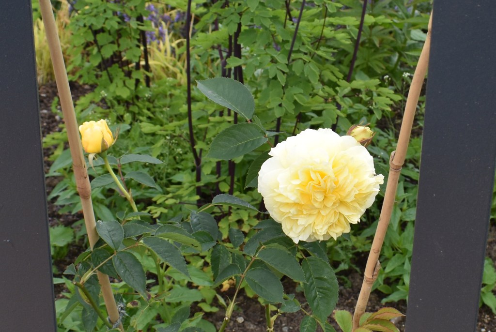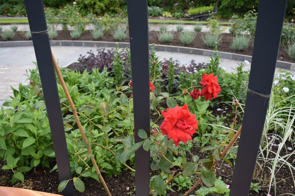 The roses by the arbours are just beginning to climb and flower. The yellow climber is ‘The Pilgrim’ (introduced 1991), the rose that is yellow in bud and creamy white in flower is ‘Claire Austin’ (2007), the pink rose is ‘Strawberry Hill’ (2006) and the red rose is ‘Danse de Feu’ (1953). All but Danse de Feu are roses bred by David Austin, the renowned rose breeder. Claire is David’s daughter, ‘Strawberry Hill’ is named for Horace Walpole’s eighteenth century estate, and ‘The Pilgrim’ refers to the Canterbury Tales. There are other roses in the outer beds, but I will find out their names later, by which time I hope to have got the names of the climbers into my head.