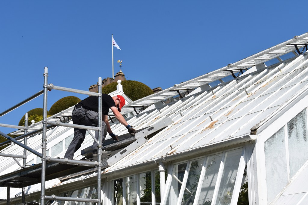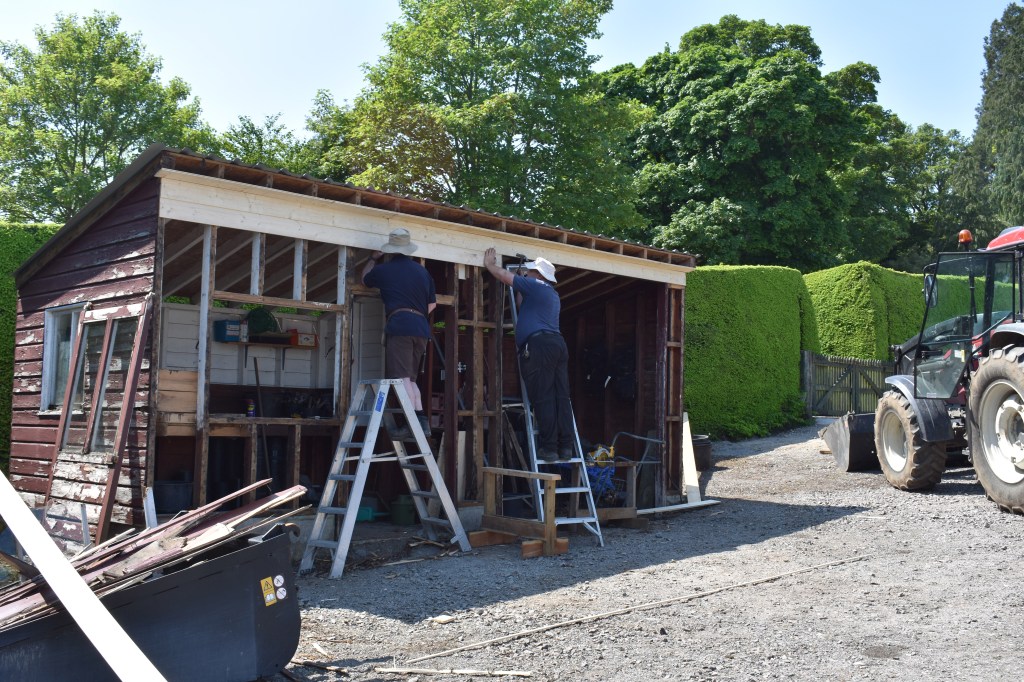 The glasshouses are always in need of maintenance, but access has been difficult involving a lot of scaffolding. Steve has now designed a system that will ensure safe and ongoing access. Scot has been brought in to fix stainless steel pegs (using resin) into the sound wood of the windows. Metal plates can fit on the pegs and repair and painting can go ahead on a regular basis. That’s another project successfully completed! Meantime Davy and Kevin have been working on shed maintenance in the nursery area.