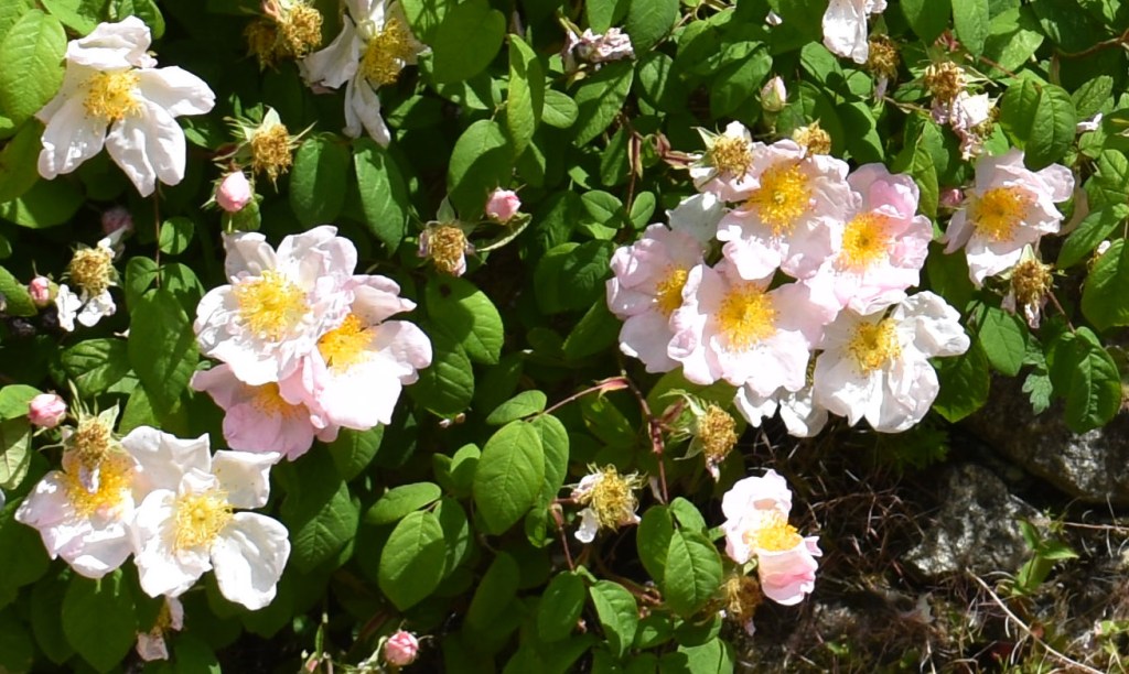 Each flower brings its own beauty, but for me the rose holds supreme. The Scots roses, Rosa pimpinellifolia, are high on my list with their ferny foliage and exquisite scent; they come early in June and last for a brief week or two. There are hundreds of different Scots roses, many growing beside derelict cottages and abandoned places. A lovely pink double grows on the old railway line in Torphins.