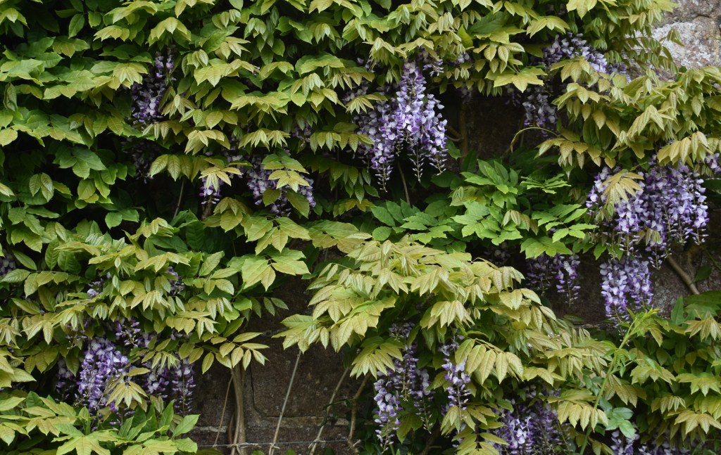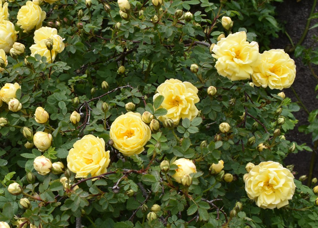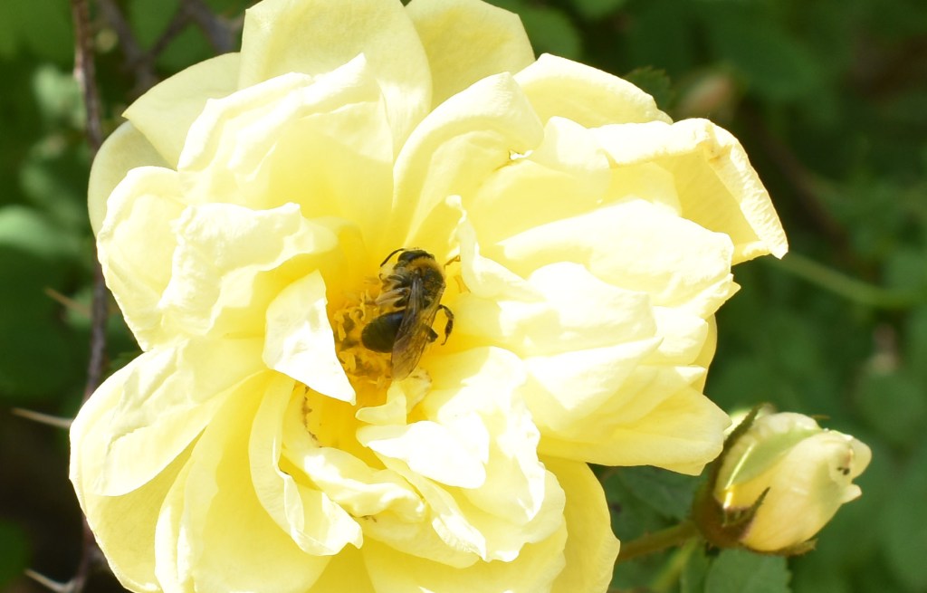 Flowering close on the heels of ‘Glory of Edzell’ is a magnificent yellow rose that blooms just under the castle and beside the steps to the Upper Pool Garden. No-one seems to know its name. Its leaves suggest a Scots rose and the scent is heavenly with a hint of lemon. There is a bonus with this rose; it is much visited by solitary bees.