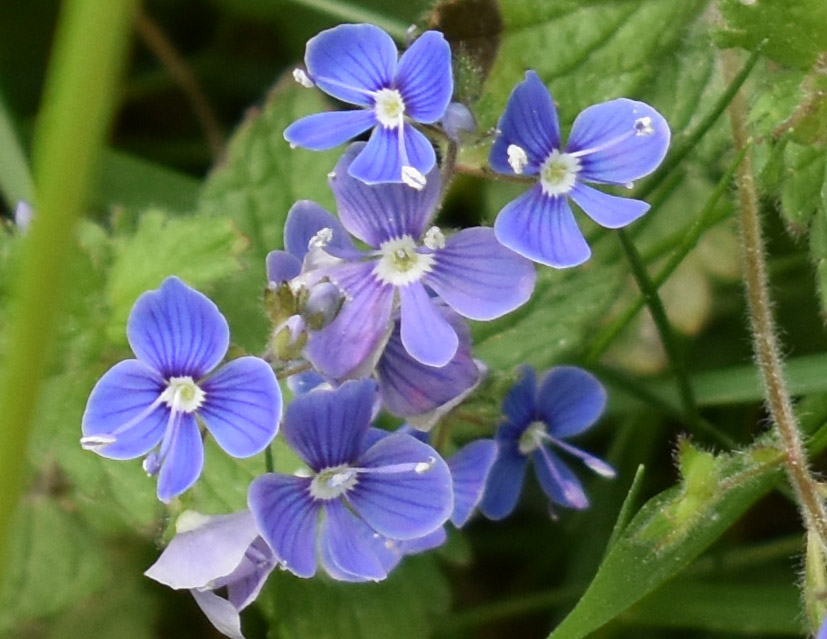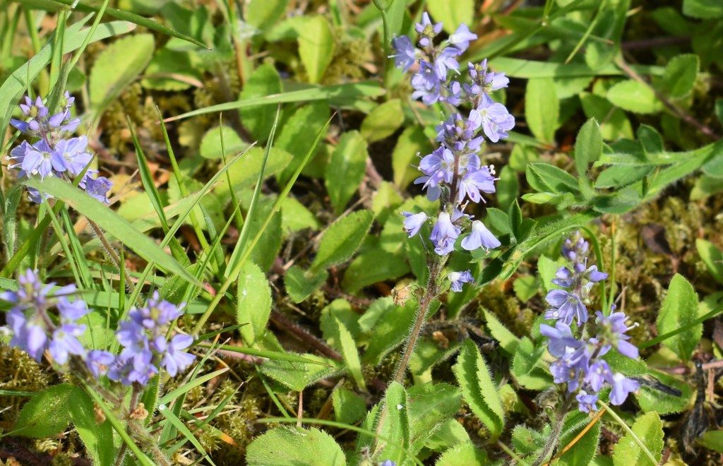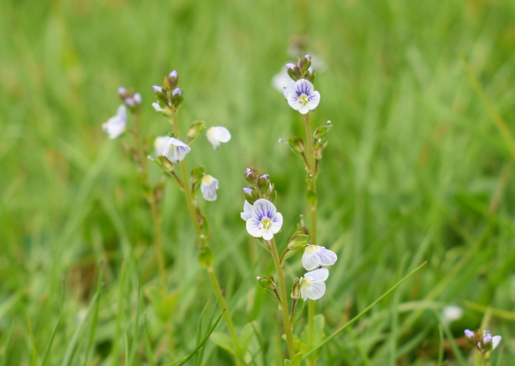 Walking up the Crathes drive the other day and seeing the bright clear blue of the germander speedwell, Veronica chamaedrys, growing in the grass, I got intrigued by the speedwells of the Scrophulariaceae or figwort family. This is a large family that includes toadflaxes, foxgloves, mulleins and eyebrights amongst others. I recognise the speedwell partly by its two stamens in an actinomorphic (symmetrical in one plane only) flower. The thyme-leaved speedwell, Veronica serpyllifolia, also grows in amongst grasses and some appeared in my own ‘lawn’. Further up the drive I find the heath speedwell, Veronica officinalis, growing in a dryer area.